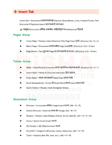 Insert Tab → Document मध्य वेगवेगळ Objects, Illustrations, Links, Header/Footer, Text