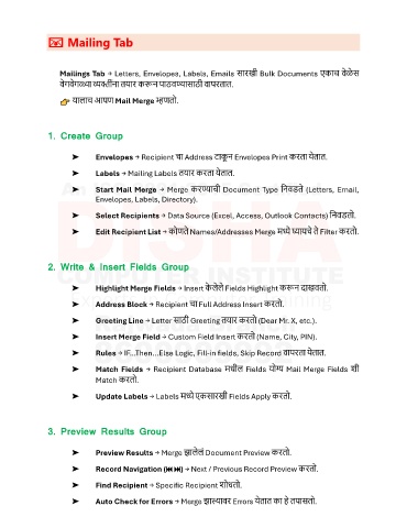 Mailings Tab → Letters, Envelopes, Labels, Emails सारखी Bulk Documents एकाच वळस
