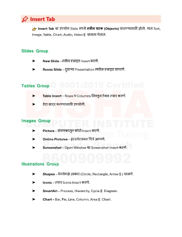 Insert Tab चा उपयोग Slide मध्य नवीन घटक (Objects) घालण्यासाठी होतो. यात Text,