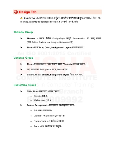 Design Tab चा उपयोग थलाइड्सिा सुदर, आकर्षक व प्रोफशनल लुक दण्यासाठी होतो. यात