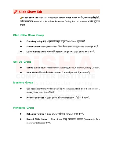 Slide Show Tab चा उपयोग Presentation Full Screen Mode मध्य दाखवण्यासाठी होतो.
